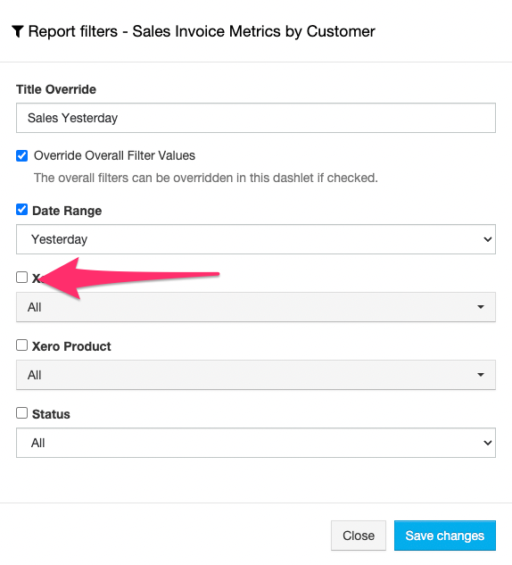 - Changes to your dashboard’s default settings will not impact your filter override settings. In this example, we want to know total sales for ‘Authorised’ Invoices that are not yet paid, which sets the criteria for what type of invoicing data is included in the results.