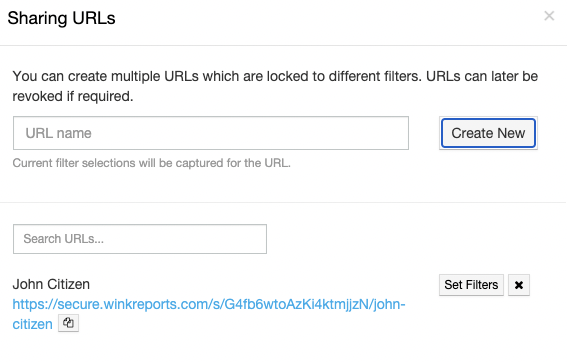 You can share Dashboards with people without a Wink Report login. You may also create different views of your Dashboard and create Custom share URLs for your team. For example, I have a Dashboard that contains various widgets that reports on sales performance for my organisation. I want to create a custom view of that same Dashboard for each salesperson in my team, that displays the individual sales performance.