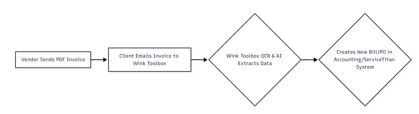 System Integration: Wink Toolbox then uses this extracted data to automatically create a new vendor bill in your accounting system (Xero, QBO, Sage Intacct) or a new Purchase Order in ServiceTitan. This can be configured to create entries in a single system or across multiple systems simultaneously.